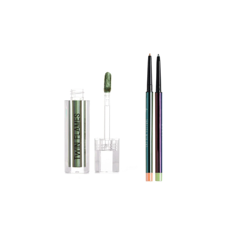 A multichrome, jewel inspired kit containing one award winning Twin Flames Multichrome Pigment and two Infinite Chrome Pencils. The versatility of this kit allows for you to create color rich, ultra chromatic looks with a single swipe of Twin Flames. Using the Infinite Chrome Pencils, create precise lines for the ultimate graphic liner look.