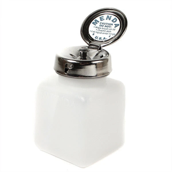 Simply push down on the metal top to pump clean fluid up into the metal “bowl” at the top. Wipes clean and locks shut for zero spillage. Strong enough to hold even acetone!