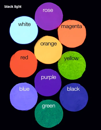 Aquacolor UV Dayglow is easy to wash off with soap and water. It is universally applicable, for example, clothing, shoes, for baldness effects and masks to achieve special lighting effects under black light.